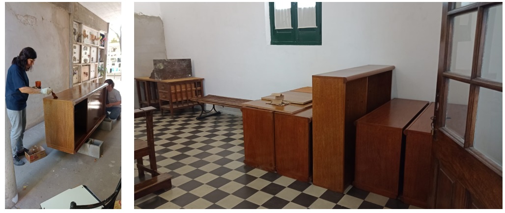 Iniciamos reformas en el edificio central para construir la oficina de Jefatura de Departamento y Dirección del Cementerio que hoy no existen. Es una deuda pendiente que va a generar un servicio mejorado al público ya que se ha concentrado todo trámite aquí y una comodidad para los agentes administrativos que vamos a trabajar más confortables. Para esto estamos en proceso de restauración de muebles que han sacado de otras oficinas, trabajamos en equipo junto a la carpintería, herrería municipal y a la Escuela Municipal de Artes y Oficios, todos hacen un gran trabajo.
