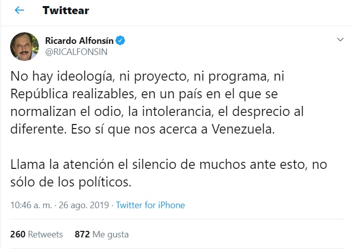 En este contexto, Alfonsín publicó en su cuenta twitter: “No hay ideología, ni proyecto, ni programa, ni república realizables en un país en el que se normalizan el odio, la intolerancia, el desprecio al diferente. Eso sí que nos acerca a Venezuela. Llama la atención el silencio de muchos ante esto, no sólo de los políticos”.