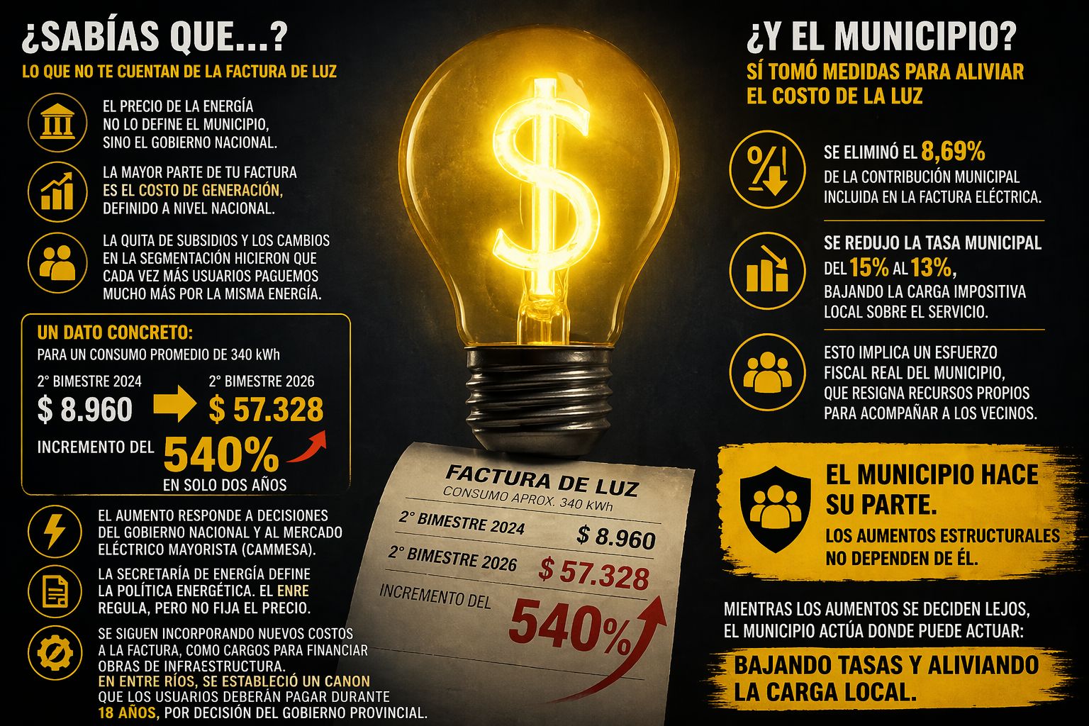 ¿Sabías que el precio de la energía eléctrica que pagás no lo define el municipio, sino el Gobierno Nacional, en el marco de las políticas energéticas impulsadas por la gestión de Javier Milei?
