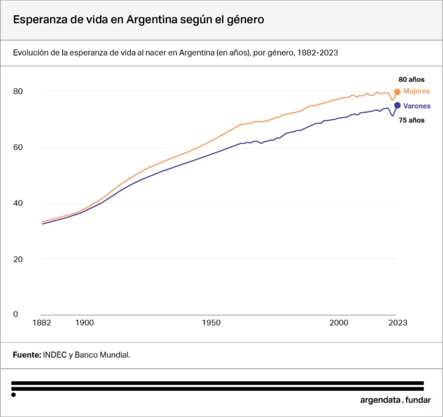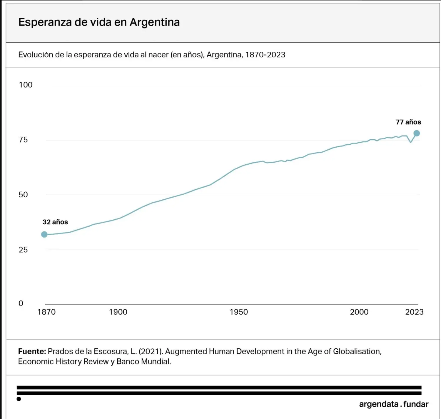 Buenas noticias: la esperanza de vida de los argentinos creció de los 32 a los 77 años entre 1870 y 2023. Esa cifra es hoy superior a la media mundial y regional, y todo indica que seguirá aumentando. La mala es que si bien la esperanza de vida al nacer más que se duplicó en un siglo y medio, en otros países creció más.