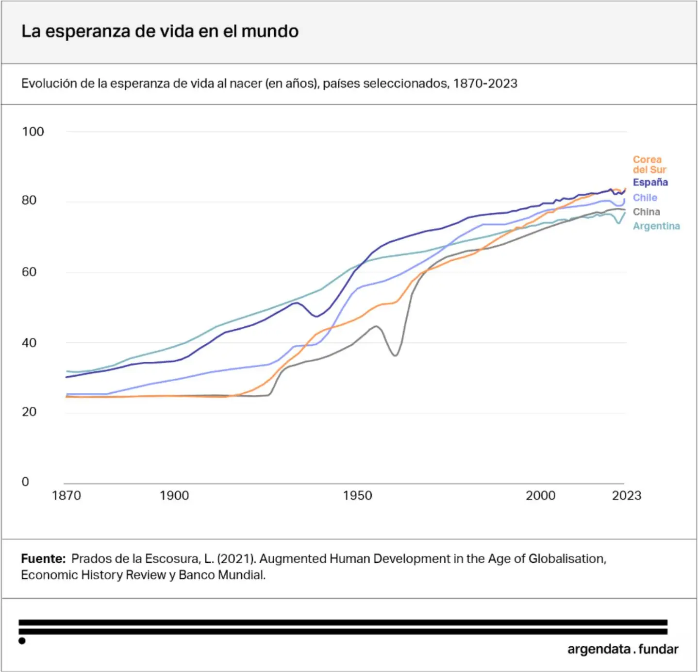 Si bien en nuestro país la esperanza de vida creció mucho, en otros creció más rápido y hoy nos superan. Aunque entre 1870 y 2023 aquí aumentó 45 años, en Chile aumentó 60 (pasó de 25 a 81), en España, 54 (de 30 a 84), en China, 53 (de 25 a 78) y en Corea del Sur, 59 (de 25 a 84).