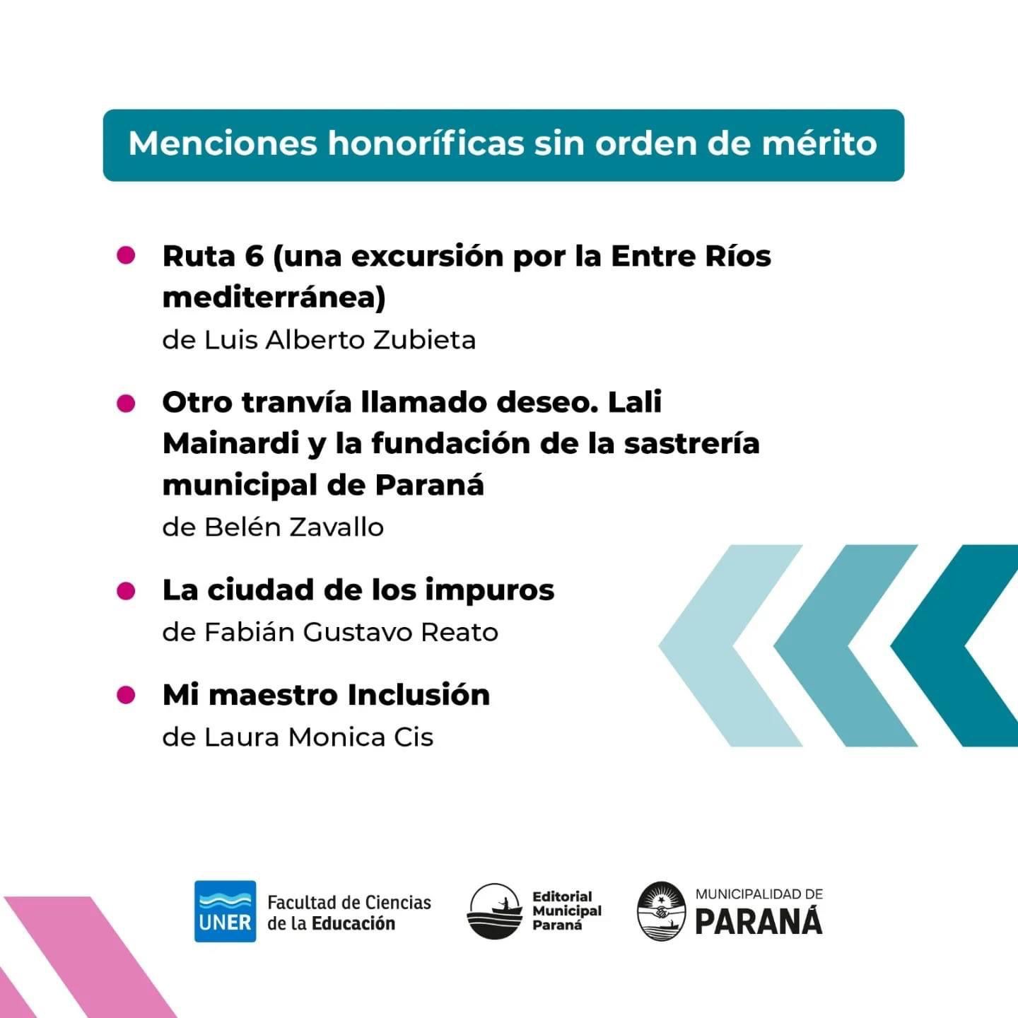 El jurado decidió, además, hacer cuatro menciones honoríficas sin orden de mérito para Belén Zavallo por su texto «Otro tranvía llamado deseo. Lali Mainardi y la fundación de la sastrería municipal de Paraná»; Luis Alberto Zubieta con su crónica titulada «Ruta 6 (una excursión por la Entre Ríos mediterránea)»; Fabián Gustavo Reato con «La ciudad de los impuros» y Laura Mónica Cis con «Mi maestro inclusión».