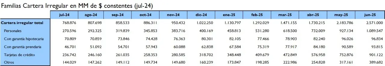 La mayor parte de esa deuda está en los créditos personales, 1,089 billones de pesos, seguido por los impagos en tarjetas de crédito, por un monto de 901.122 millones de pesos.