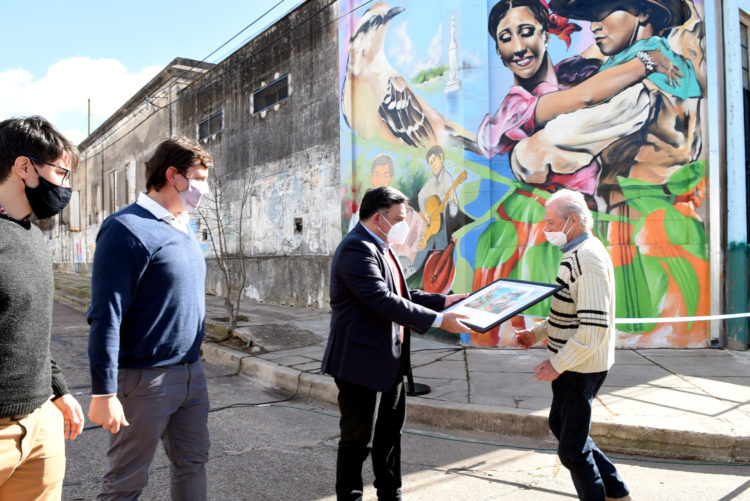 Más adelante, se entregaron obsequios a los artistas que hicieron este mural. En primer lugar el intendente Martín Oliva y la directora de Turismo María Laura Saad otorgaron presentes a Teko Garrido; y el viceintendente Ricardo Vales y el secretario de Cultura, Turismo y Deportes Sergio Richard hicieron lo propio con Luis Gauna.