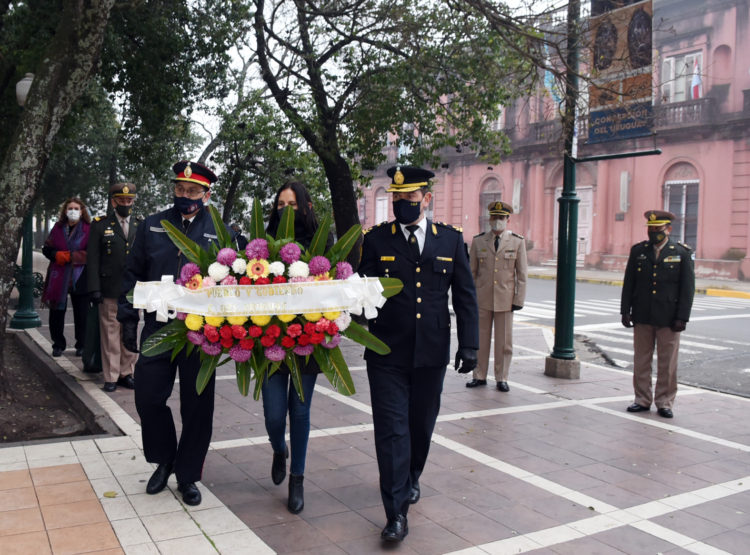 La ceremonia, presidida por el intendente Martín Oliva, el Presidente del Concejo Deliberante Ricardo Vales, y el acompañamiento de secretarios y coordinadores generales del Departamento Ejecutivo Municipal, jefes de las distintas fuerzas Armadas y de Seguridad, inició a las 8 de la mañana con el izamiento del Pabellón Nacional, acción que estuvo a cargo de los jefes del Batallón de Ingenieros Blindado 2, Teniente Coronel Diego Margarián y del Jefe de Prefectura de Puerto Prefecto Juan Manuel Gauna y; del Secretario de Cultura, Turismo y Deportes de la Municipalidad Sergio Richard.