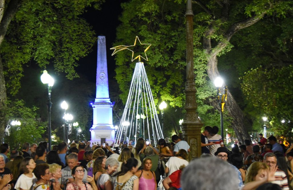 El esplendor de las luces blancas del árbol, sumado a las luces blancas que fueron colocadas en todas las columnas del interior de Plaza Ramírez, no solo brindó un brillo especial a la noche, sino que también permitió destacar la enorme estrella de luces amarillas que se luce sobre el tradicional árbol.