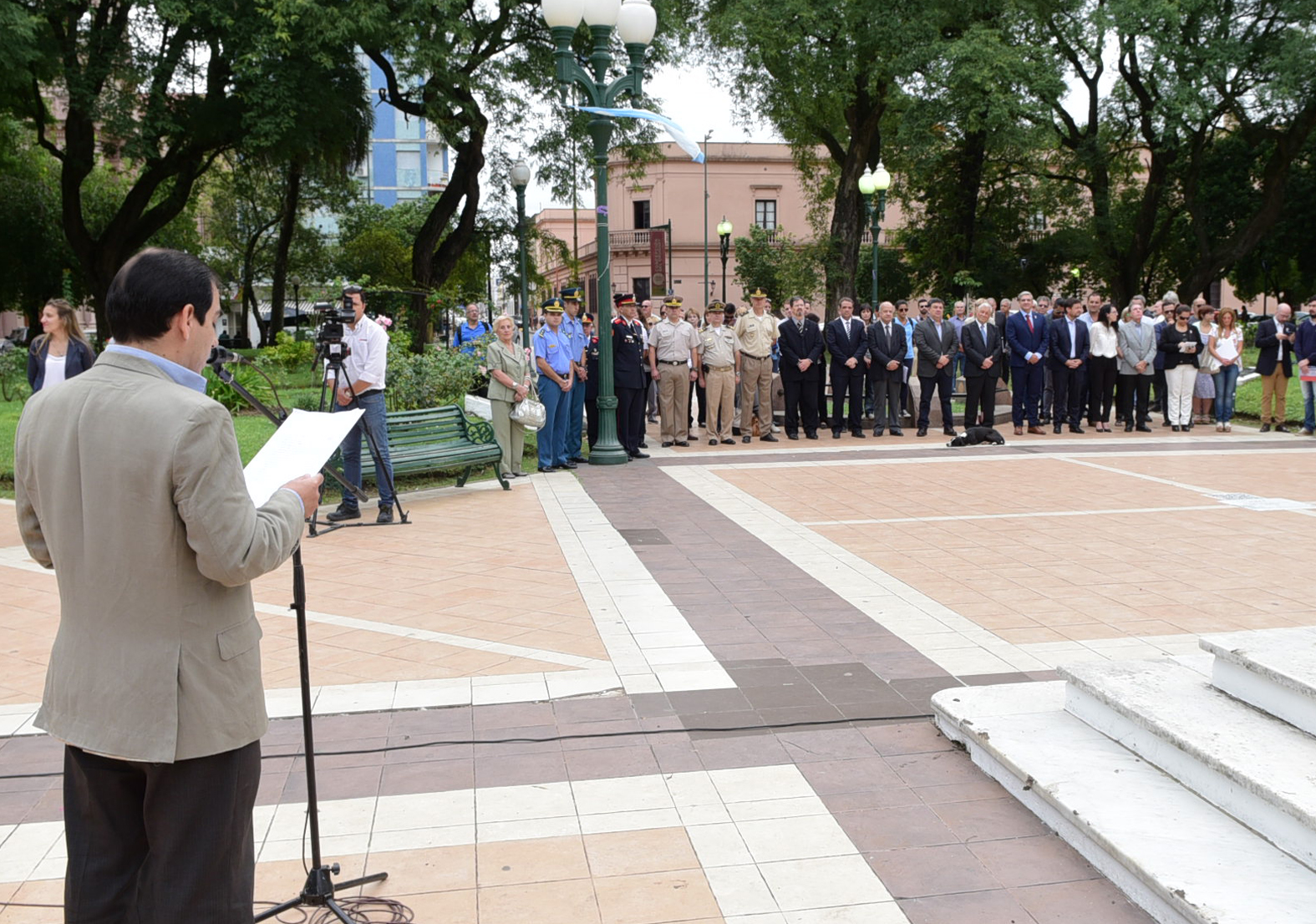 Previamente, el presidente municipal José Lauritto, el Juez Federal Dr. Pablo Seró y el presidente de la Cámara de Apelaciones Dr. Gustavo Marcó, depositaron una ofrenda floral al pie de la pirámide, e inmediatamente hizo uso de la palabra el coordinador general de Evaluación Política y Control Presupuestario de la Municipalidad, Fernando Picart.