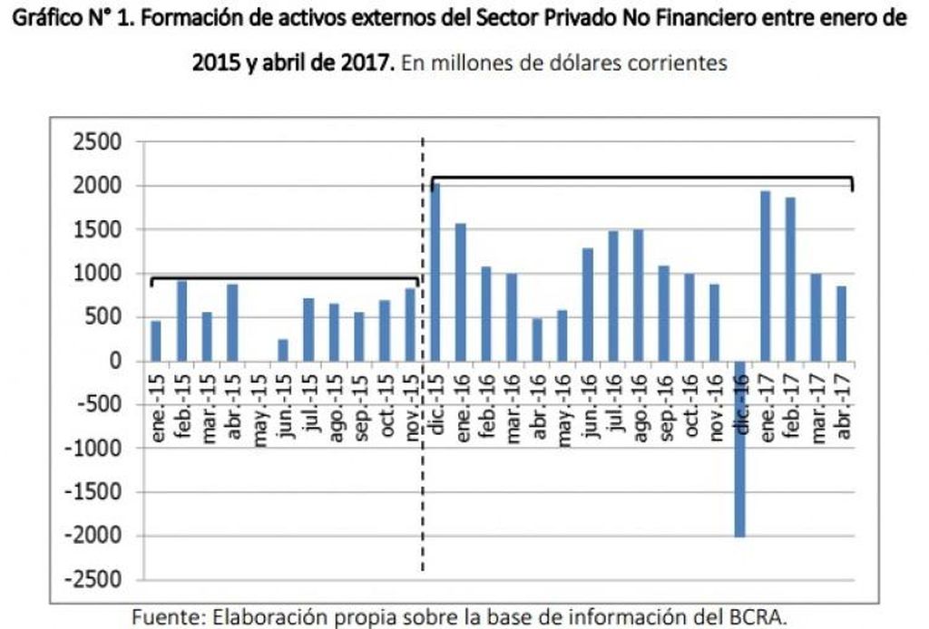 En los primeros cuatro meses del 2017 la fuga de divisas alcanzó 5.650 millones de dólares, un 40% más que lo registrado en los mismos meses del año anterior. En este sentido el promedio mensual de fuga, entre enero y noviembre de 2015 fue de 590 millones de dólares, mientras que entre diciembre de 2015 y abril de 2017 el promedio de salida mensual es de 1.037 millones de dólares, lo que indica un aumento del 75%, confirmó el informe.