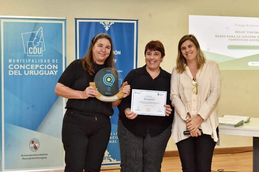 La directora de Capacitación y Calidad, Mónica Beber, recibió la placa de manos de la subsecretaria de Calidad, Accesibilidad y Sustentabilidad del Turismo Nacional, María Inés Albergucci, y de la secretaria de Turismo de la provincia, María Laura Saad.