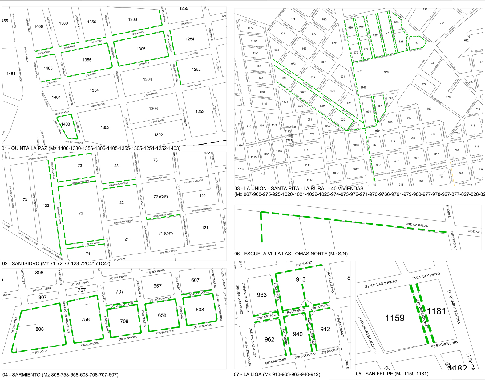 La Unión, La Rural y 40 Viviendas: Magaldi, entre Espinillo y Díaz Vélez; Magaldi, entre Espinillo y Ceibo; Magaldi, entre Ceibo y Jacarandá; Magaldi, entre Jacarandá y Ombú; Magaldi, entre Ombú y Lacava; Filiberto, entre Díaz Vélez y Ceibo; Filiberto, entre Ceibo y Jacarandá; Filiberto, entre Jacarandá y Ombú; Filiberto, entre Ombú y Lacava; Lapacho, entre Espinillo y Díaz Vélez; Díaz Vélez, entre 12 de Octubre y Don Bosco; Díaz Vélez, entre Don Bosco y Allais; Díaz Vélez, entre Allais y Rubinsky; Díaz Vélez, entre Rubinsky y 11 del Norte; Díaz Vélez, entre 11 y 12 del Norte; Díaz Vélez, entre 12 y 13 del Norte; Morend, entre Díaz Vélez y La Rural; Celia Torrá, entre Morend y Rubinsky; República del Líbano y Rubinsky; La Rural, entre Torrá y República del Líbano; República del Líbano, entre La Rural y Rubinsky; Rubinsky, entre Díaz Vélez y Torrá; Rubinsky, entre Torrá y República del Líbano; 11 del Norte, entre Díaz Vélez y Torrá; 11 del Norte, entre Torrá y República del Líbano; 11 del Norte, entre República del Líbano y Hernández; 11 del Norte, entre Hernández y Ruiz Moreno; 11 del Norte, entre Ruiz Moreno y calle pública; 11 del Norte, entre calle pública y Panizza; Torrá, entre 11 y 12 del Norte; Torrá, entre 12 y 13 del Norte; República del Líbano, entre 11 y 12 del Norte; República del Líbano, entre 12 y 13 del Norte; Hernández, entre 11 y 12 del Norte; Hernández, entre 12 y 13 del Norte; Ruiz Moreno, entre 11 y 12 del Norte; Ruiz Moreno, entre 12 y 13 del Norte; Panizza, entre 11 y 12 del Norte; Panizza, entre 12 y 13 del Norte; calle pública, entre 11 del Norte y Panizza.