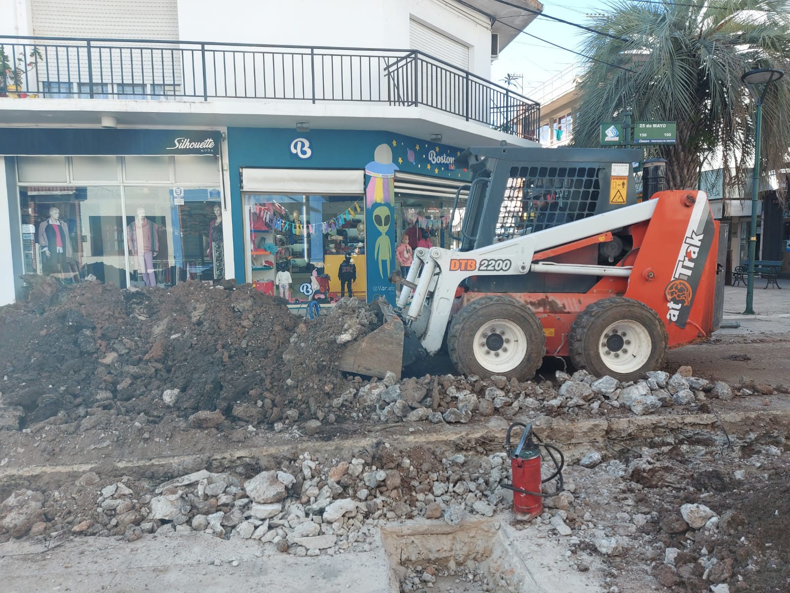 Operarios están abocados a las tareas de excavación de zanjas en la esquina de calles 25 de Mayo y Rocamora, donde culmina la instalación de un nuevo tramo del primer sector de la obra.