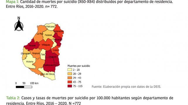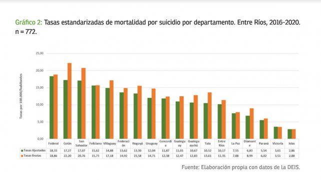 De acuerdo al Ministerio de Salud de Entre Ríos, la provincia no escapa a la problemática del suicidio: entre 2001 y 2016 se registraron 2.265 muertes por esta causa con tendencia al aumento. Entre 2016 y 2020, se registró un total de 776 muertes por suicidio. La cartera sanitaria también informó que los departamentos con las tasas más elevadas son Federal, Colón, San Salvador y Feliciano, dando como resultado una tasa ajustada de mortalidad de 10,17 por cada 100.000 habitantes.