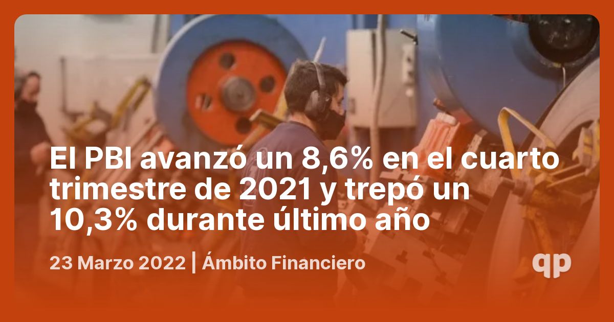 El Producto Interno Bruto (PIB) de Argentina mejoró un fuerte 8,6% interanual en el cuarto trimestre pasado y sirvió para trepar al 10,3% en el...