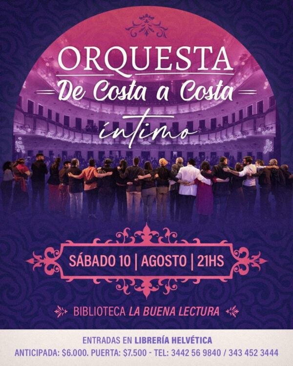By La Ciudad08/08/2025Este sábado 10 de agosto a las 21 hs se presenta la Orquesta De Costa a Costa en la Biblioteca La Buena Lectura. Las entradas son limitadas y tendrán un valor de...