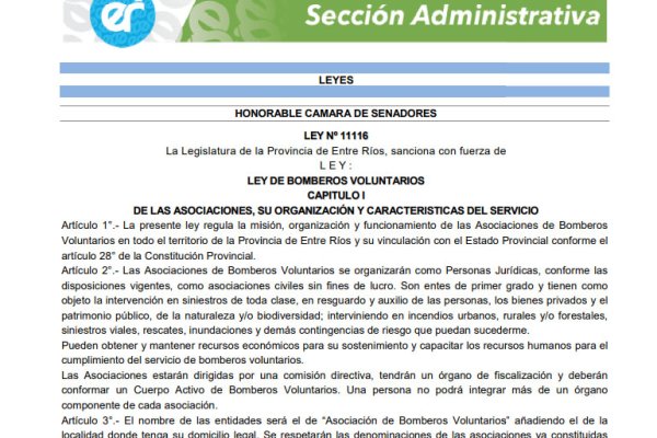 La promulgación y publicación de la Ley 11.116 que regula la misión, organización y funcionamiento de las Asociaciones de Bomberos Voluntarios “es...