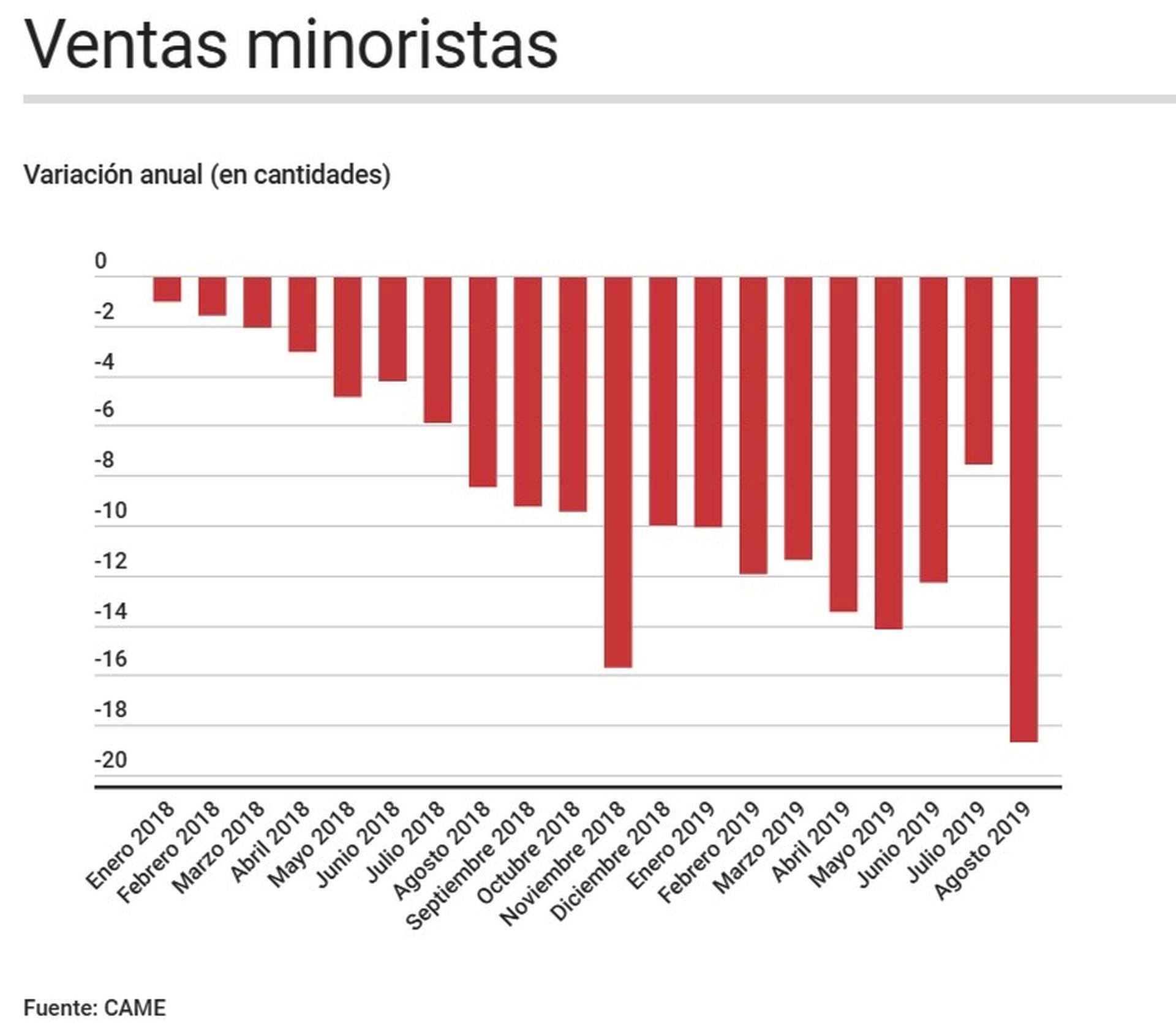 By La Ciudad06/10/2019El consumo minorista tuvo durante agosto su peor caída en el año. Las ventas del sector se desplomaron un 18,6% en comparación con el mismo mes...