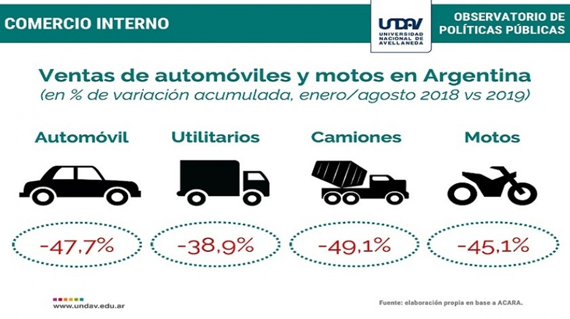 By La Ciudad29/09/2019El Observatorio de Políticas Públicas de la Universidad Nacional de Avellaneda (UNDAV) reveló que las ventas de automóviles cayeron un -47,7%; camiones -49,1%;...