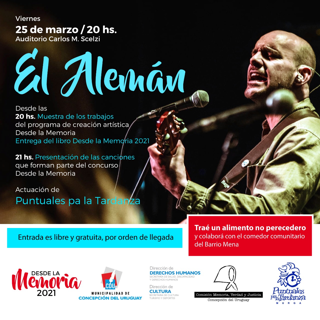 Esta noche, a las 21 horas, en el Centro Cultural Murgalpón, se presentará el artista uruguayense Gerardo Dorado, más conocido como El Alemán....