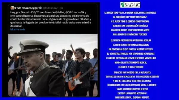 Federico Sturzenegger anunció la eliminación de las sociedades de gestión colectiva SADAIC, SAGAI, AADI-CAPIF, DAC y ARGENTORES». Respuesta de Sadaic El ministro de...