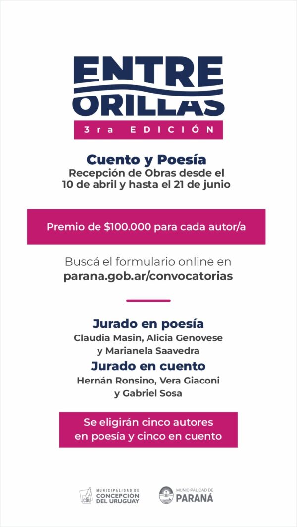 El certamen Literario Entre Orillas, organizado por tercer año consecutivo entre los Municipios de Paraná y Concepción del Uruguay, se presentará...