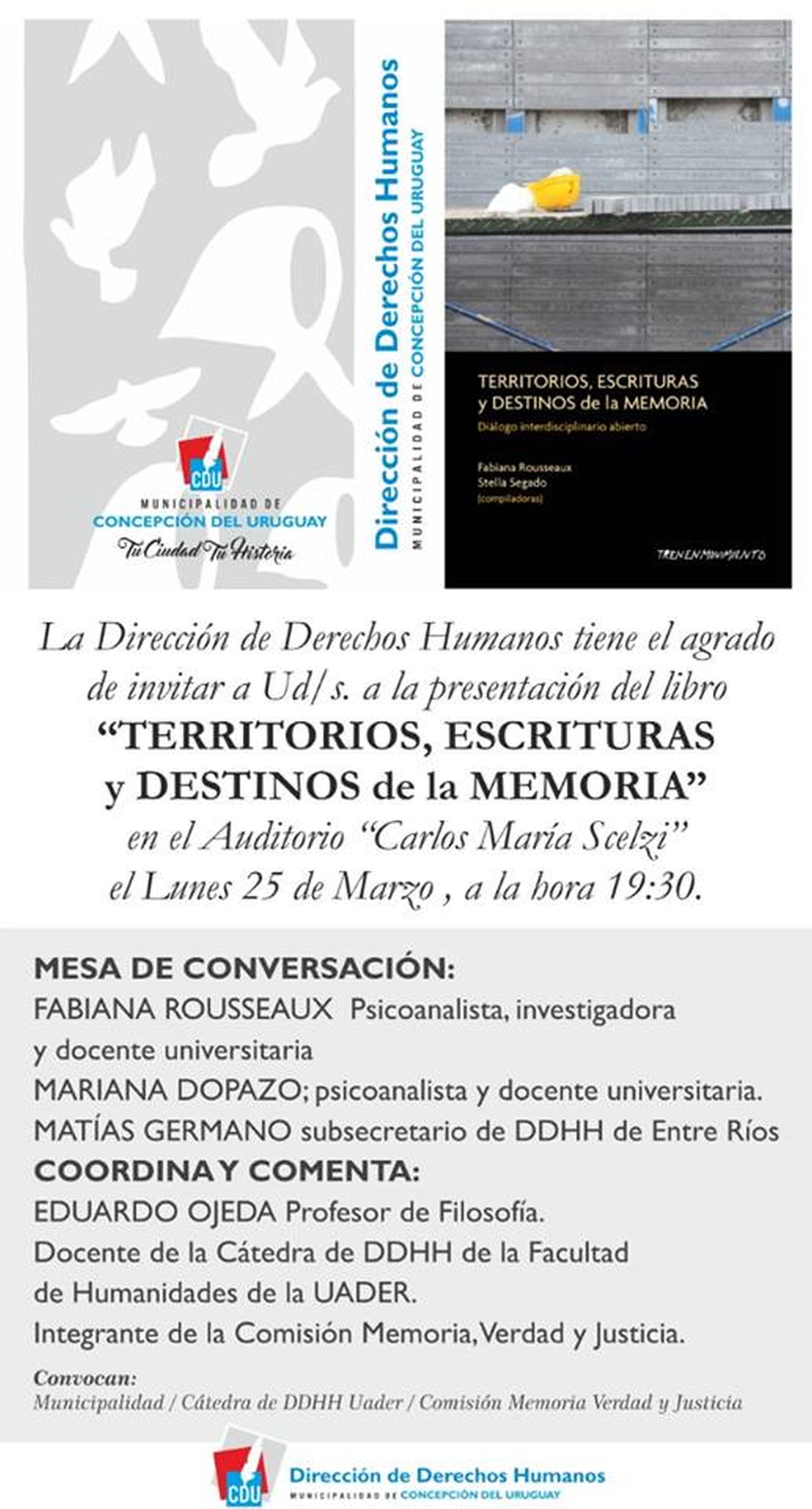 By La Ciudad20/03/2019En el marco de la Semana de la Memoria, se invita a la comunidad a la presentación del libro «Terrorismo, escrituras y destinos...