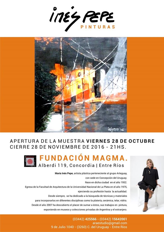 By La Ciudad22/11/2016La artista uruguayense Inés Pepe -integrante del grupo Arteguay- expone sus pinturas en la Fundación Magma de Concordia desde el 28 de octubre...