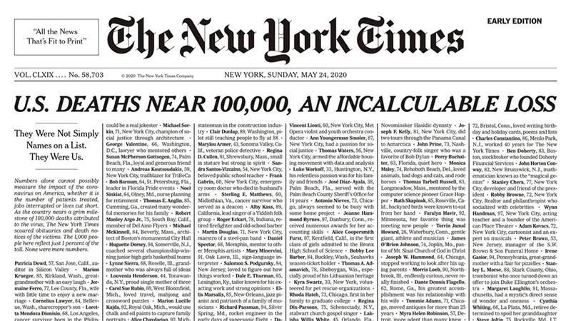 By La Ciudad01/07/2020«Las muertes en EE.UU. llegan a 100.000, una pérdida incalculable», publicó el The New York Times en su portada de este domingo. En...