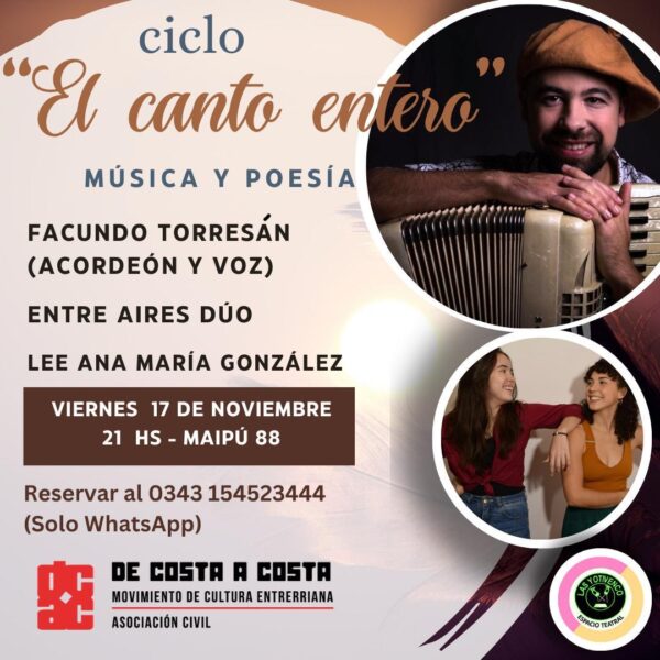 Continua este viernes 17/11 «EL CANTO ENTERO» ciclo de música y poesía del movimiento De Costa a Costa. *Entre Aires* el dúo compuesto...