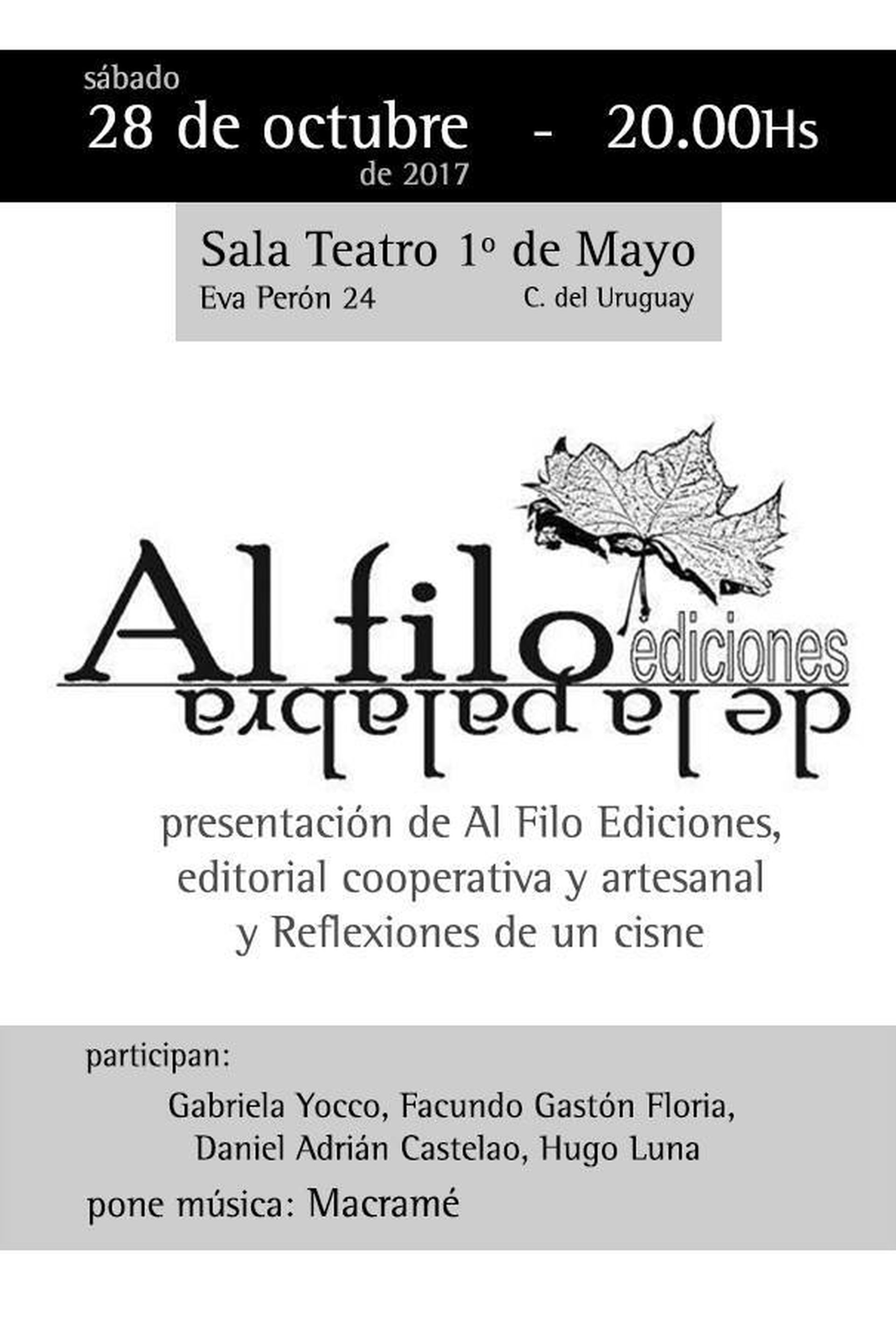By La Ciudad29/10/2017AL FILO EDICIONES, una editorial que se define como un proyecto editorial artesanal, colectivo, autogestivo, anticapitalista y sin fines de lucro, realizará su...