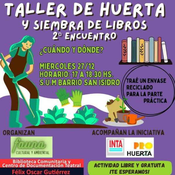By Leo Iglesias01/10/2024Taller de huerta y Siembra de libros. Día: Miércoles 27/12/2023 Hora: 17 hs. Lugar: SUM Barrio San Isidro (Esquina Urquiza y Tulipanes). Actividad...