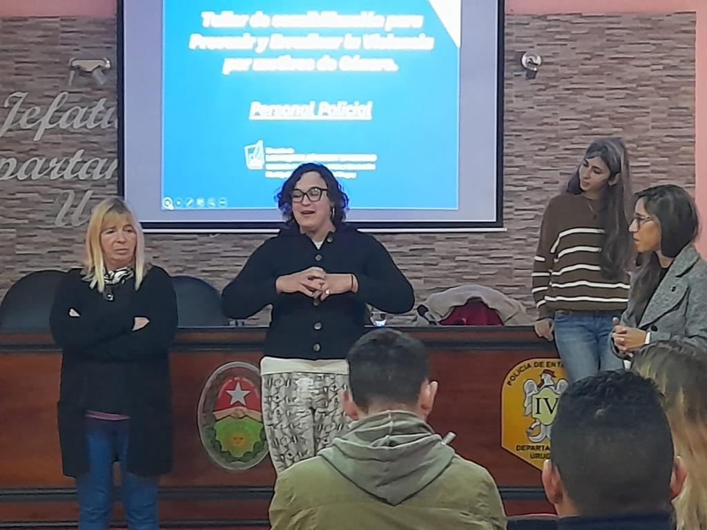 La semana pasada realizamos el Taller de Sensibilización al Personal Policial en la Jefatura de Policía de Concepción del Uruguay, el cual tuvo como objetivo brindar al personal policial recursos del municipio de Concepción del Uruguay para lograr una mayor y mejor articulación entre la policía y la Dirección de Mujeres, Géneros y Diversidad junto con el fortalecimiento del proceso de atención y toma de denuncia por motivos de violencia de género que realiza el personal policial.