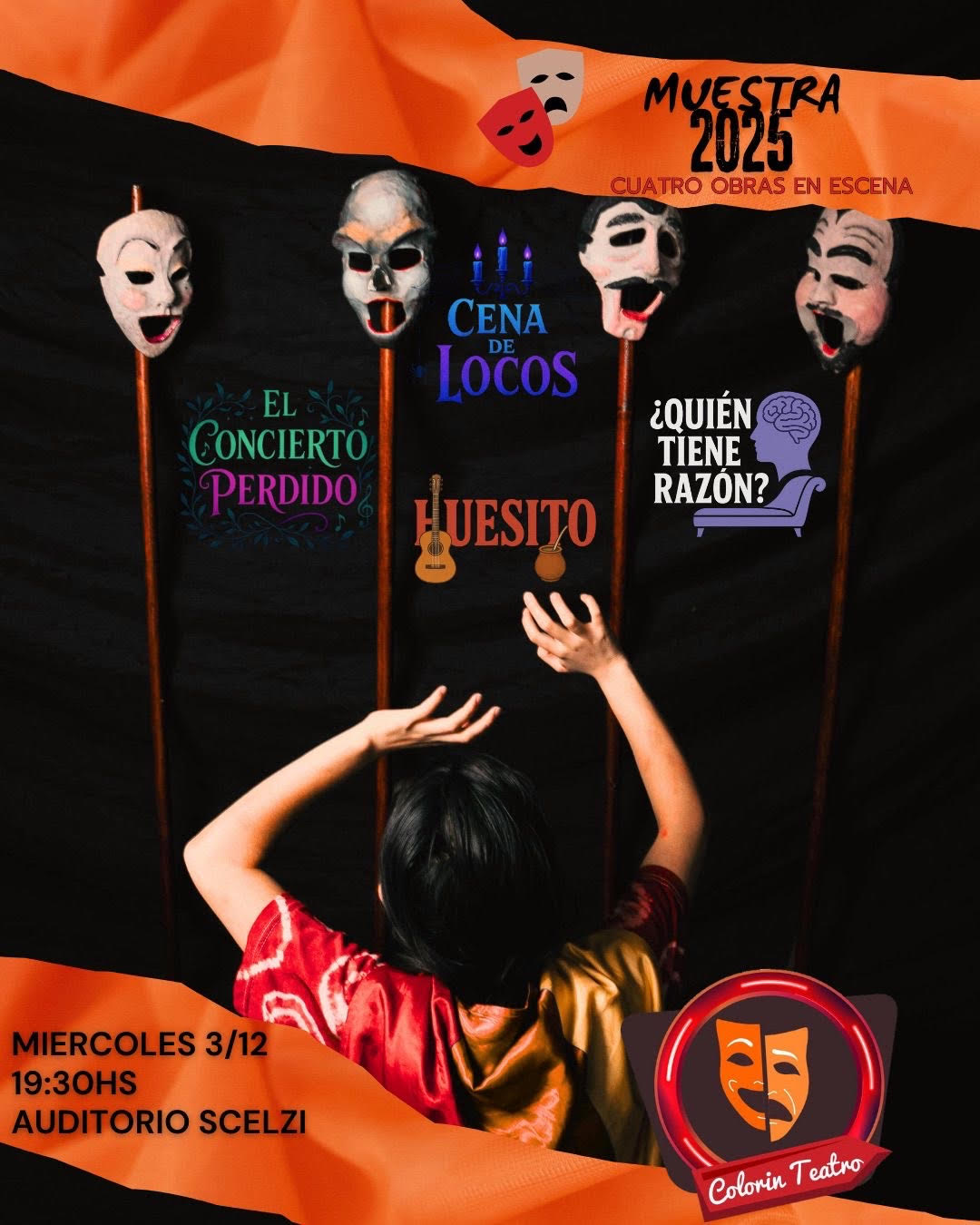 Las propuestas seleccionadas para esta muestra de fin de año son: “El concierto perdido” (grupo Peques; texto original de Moira Zaffaroni), “Cena de Locos” (grupo Preadolescentes/Adolescentes; adaptación), “¿Quién tiene razón?” (grupo Adolescentes; texto original de Moira Zaffaroni) y “Huesito” (participación especial del Elenco Colorín; adaptación).