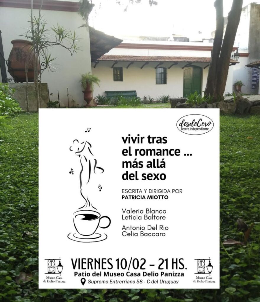 El viernes 10 de febrero próximo a las 21 hs, en el patio del Museo Casa Delio Panizza, el Grupo de Teatro Independiente “Desde Cero” vuelve a poner en escena la obra “Vivir tras el romance… más allá del sexo”, escrita y dirigida por Patricia Miotto, con las actuaciones de Valeria Blanco y Leticia Baltoré, y la música en vivo interpretada por la guitarra del gran Antonio Del Río y la voz de Celia Baccaro.