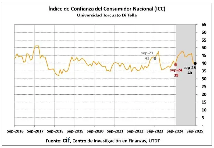 La Universidad Di Tella resaltó que la confianza del consumidor se situó en 39,81 el mes pasado, con lo cual cayó 0,33% respecto a agosto.