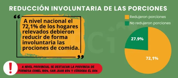 La inseguridad alimentaria se define como la reducción de porciones y/o supresión involuntaria de comidas en el hogar. Del relevamiento surgió que el 76,5% de las familias se vieron obligadas a reducir sus porciones o suprimir comidas, por la imposibilidad de contar con los recursos suficientes para adquirir algunos de los alimentos indispensables. La convocatoria a las familias se efectuó desde espacios comunitarios (comedores, merenderos, clubes, iglesias) ubicados en barrios populares con alta vulnerabilidad socio-sanitaria-ambiental.