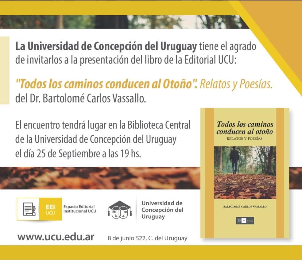Este lunes 25 de septiembre a las 19.00 se llevará a cabo la presentación del libro «Todos los caminos conducen al otoño», de Bartolomé Carlos Vassallo.