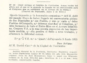 Artigas escribió acerca de la convocatoria del Congreso “… creo ya oportuno reunir en Arroyo de la China un congreso compuesto de los diputados de los pueblos y, para facilitar el modo de la elección tengo el honor de acompañar a usía el adjunto reglamento confiando en el esmero de su ilustre corporación que, eludiendo hasta el menor motivo de demora, al momento de recibir esta de las disposiciones competentes para que con igual actividad se proceda en ese departamento a la reunión de las asambleas electorales, encargando muy particularmente que los ciudadanos en quienes la mayoridad de votos haga recaer la elección sean inmediatamente provistos de sus credenciales y poderes y se pongan con toda prontitud en camino al indicado punto del Arroyo de la China, no siendo posible fijar otros que aminore la distancia por ser el prescripto un punto medio relativamente a los demás pueblos que deben concurrir. El orden, la buena fe y la voluntad deben caracterizar el fondo que recomiendo al celo de usía”