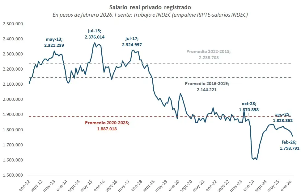En ese escenario, los salarios -tanto públicos como privados- vienen ajustando sistemáticamente por debajo de los precios, consolidando un esquema donde tener empleo formal ya no garantiza salir de la precariedad. El salario real de los trabajadores registrados cayó por sexto mes consecutivo en febrero, “los salarios reales privados registrados cayeron 1,3% en febrero, acumulando una pérdida de 3,6% en los últimos seis meses (desde agosto de 2025): similar al primer semestre de 2018 (-3,7%) y al arranque de la pandemia (abr-oct 2020: -4,1%), solo que ahora con apreciación cambiaria”, señaló un informe de la Gerencia de Estudios Económicos del Banco Provincia.