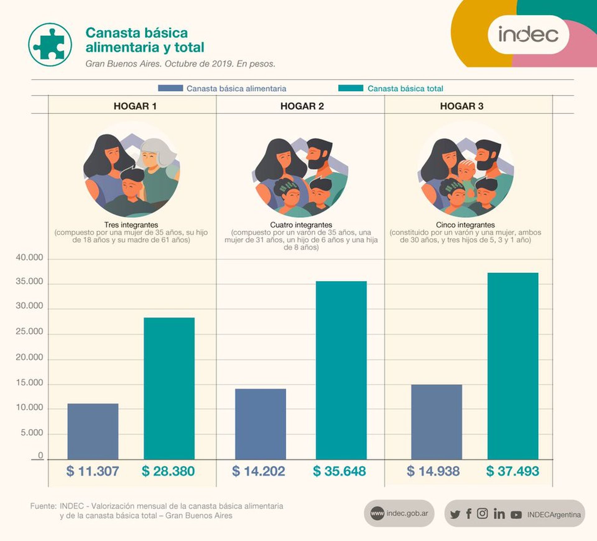 «Una familia de cuatro integrantes necesitó $35.647,66 para superar el umbral de pobreza en octubre de 2019; 47,1% más que en octubre de 2018«, remarcó el organismo oficial al presentar el informe.