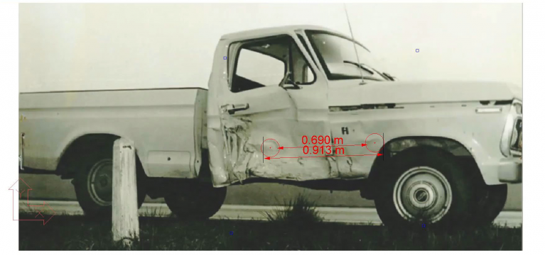 Al momento del impacto, el auto de Ponce de León chocó el costado de la camioneta, completamente cruzada sobre la traza de la ruta. “La afirmación del conductor de la camioneta era que el vehículo estaba en movimiento, pero el lateral derecho tenía dos redondeles compatibles con los aros de los focos de iluminación delantera del Renault 4. La distancia de separación entre los aros que dejó la impronta coincide exactamente con la distancia de separación de los focos, esa la primera cuestión que sale: el vehículo no estaba en movimiento porque, si hubiese estado, el rastro deja una estela, se produce una deformación de la impronta y no son perfectos, como los de la foto”, señaló Geretto.