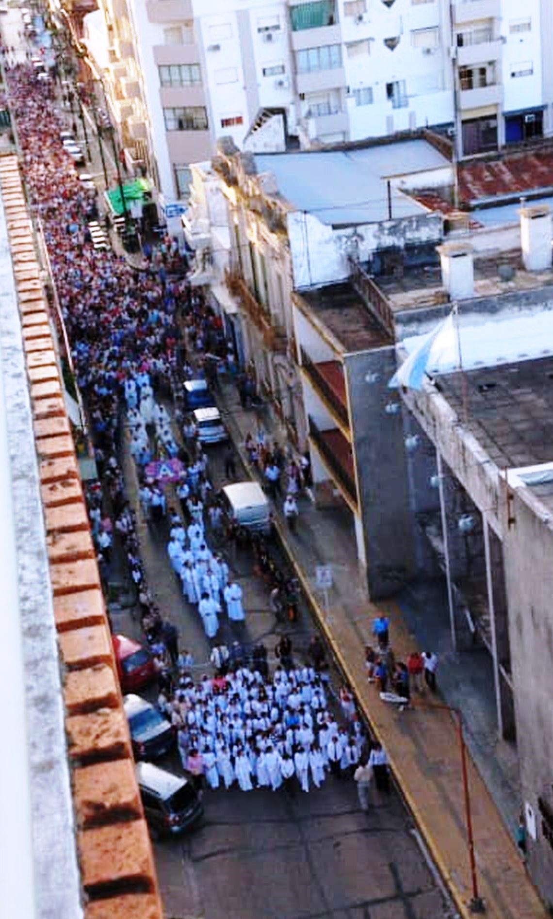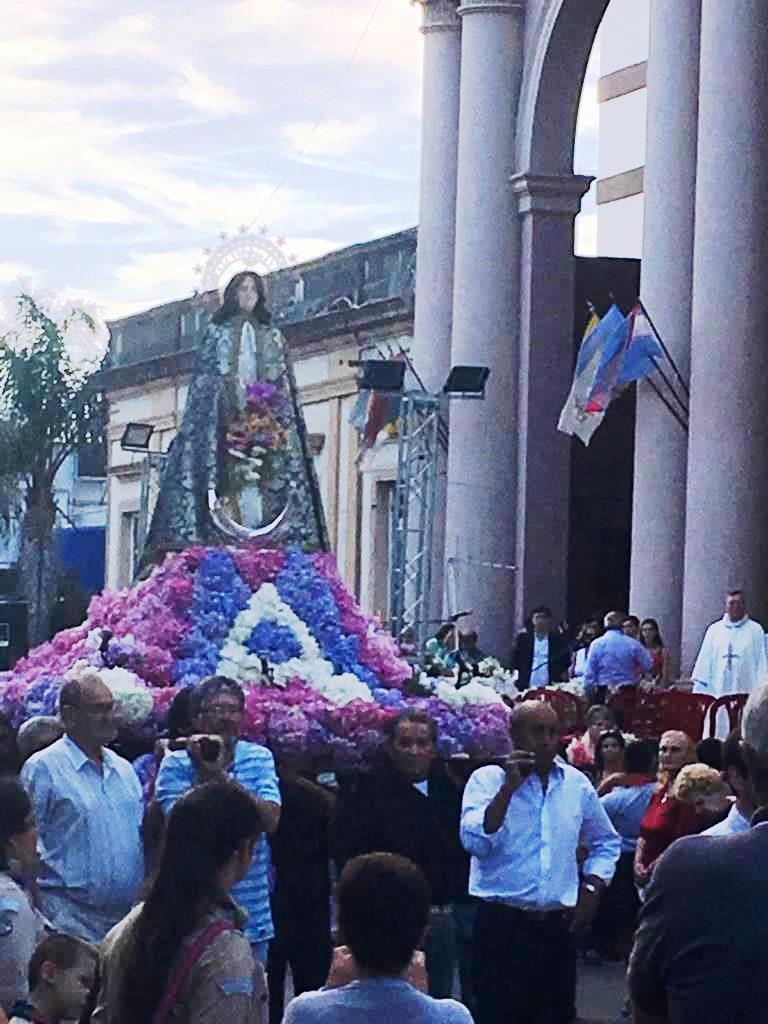 Tras el primer saludo de los fieles, brindado en los primeros minutos de la jornada -después de la Marcha Joven y de la Cantata, a cargo de la banda Ministerio de Música Joven-, la imagen de la Virgen -engalanada con hortensias, jazmines y agapantos- salió a las 19:00 del templo mayor para presidir la tradicional recorrida por las calles 3 de Febrero/Urquiza, Galarza, Jordana y San Martín, en medio de un toque de diana y del Himno Nacional Argentino, ejecutados por la Banda del Batallón de Ingenieros Blindado 2.