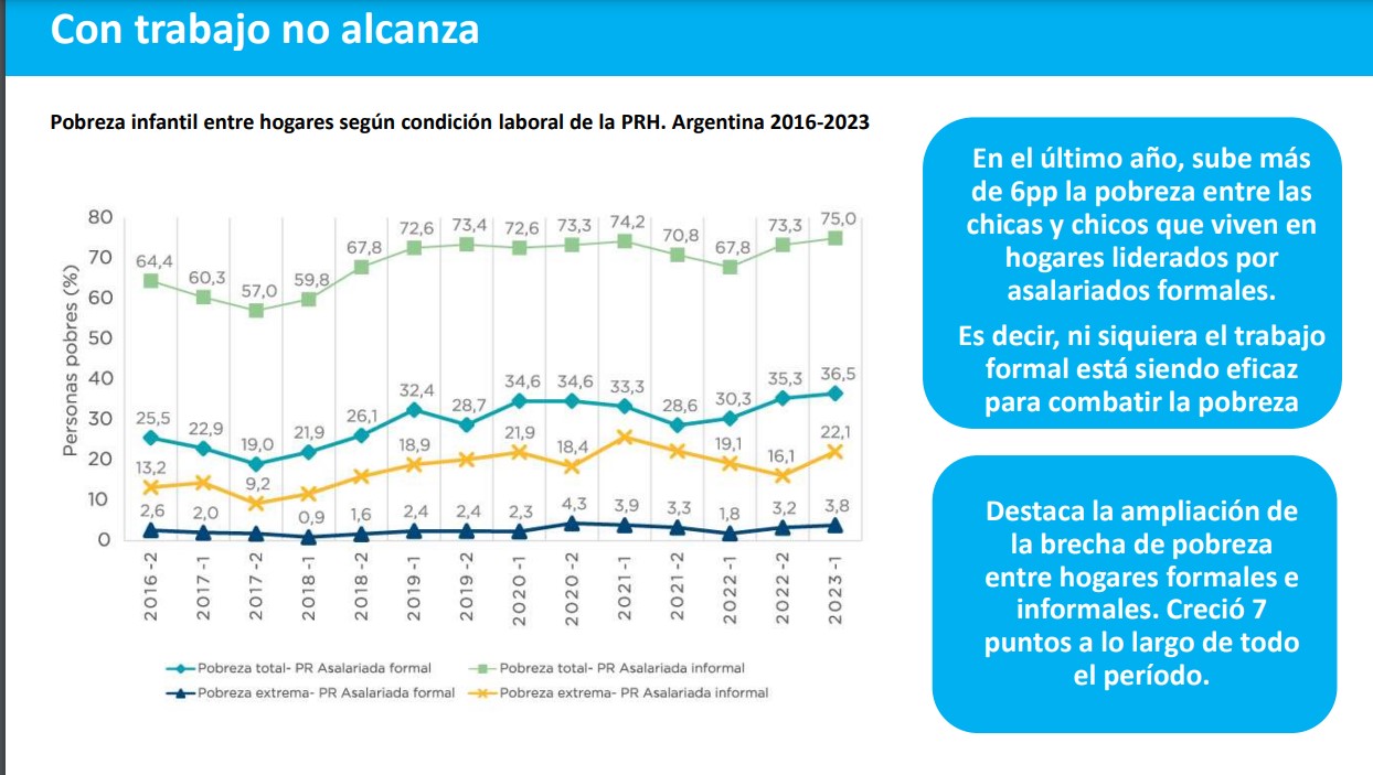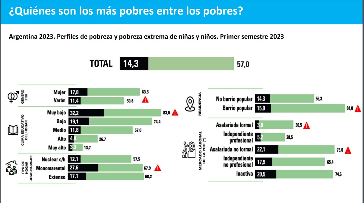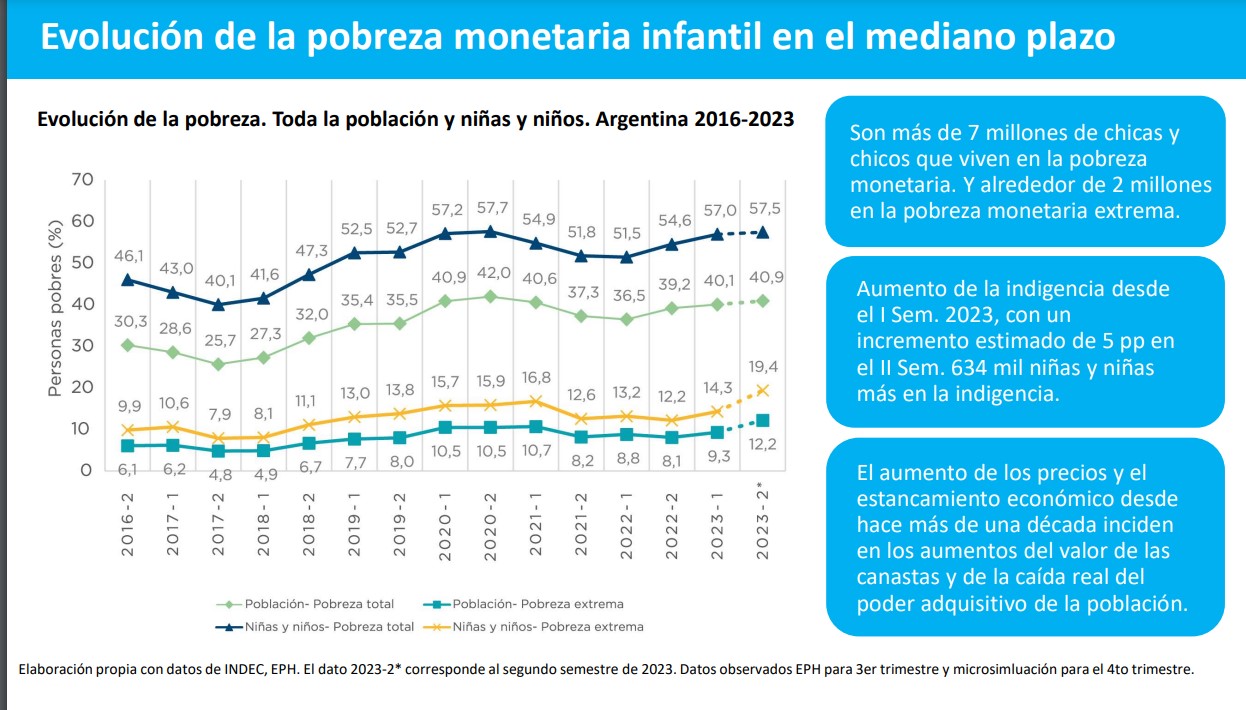 Destaca que en 2023 se observa un aumento de la indigencia y se estima que habría alcanzado al 19,4% de las chicas y chicos para el segundo semestre.