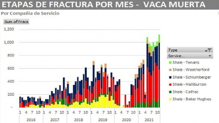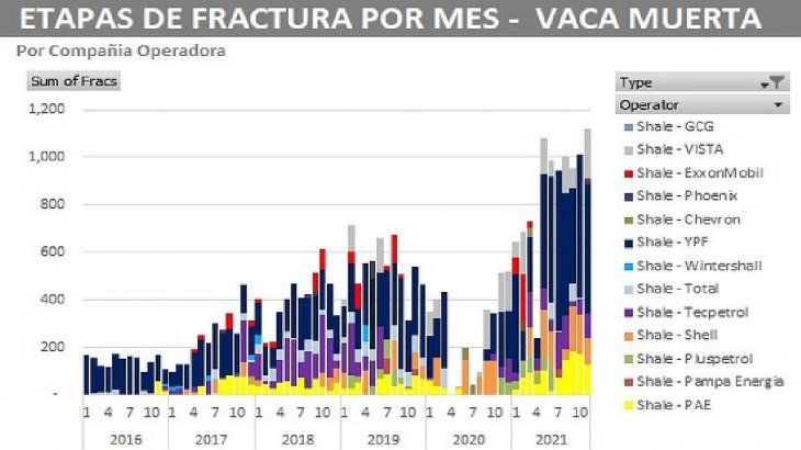 En el acumulado anual del 2021 ya se suman 6.428 etapas de fractura, otro hito en la historia de los hidrocarburos argentinos. Se espera que el año finalice por encima de las 7.000. El 2019 cerró con 6.425 y el 2020 de la pandemia con 3.276.
