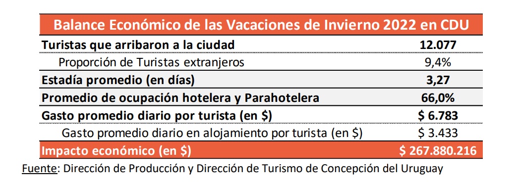 Concepción del Uruguay recibió 12.077 turistas durante las vacaciones de invierno, que dejaron un impacto económico de $267,9 millones entre gastos de alojamiento, comidas, transporte, salidas y recreación. Del viernes 8 de julio al domingo 31, se ocuparon en promedio el 66,0% de las plazas de alojamiento disponibles, con picos de ocupación mayores al 80% durante los 4 fines de semana que abarcaron las vacaciones.