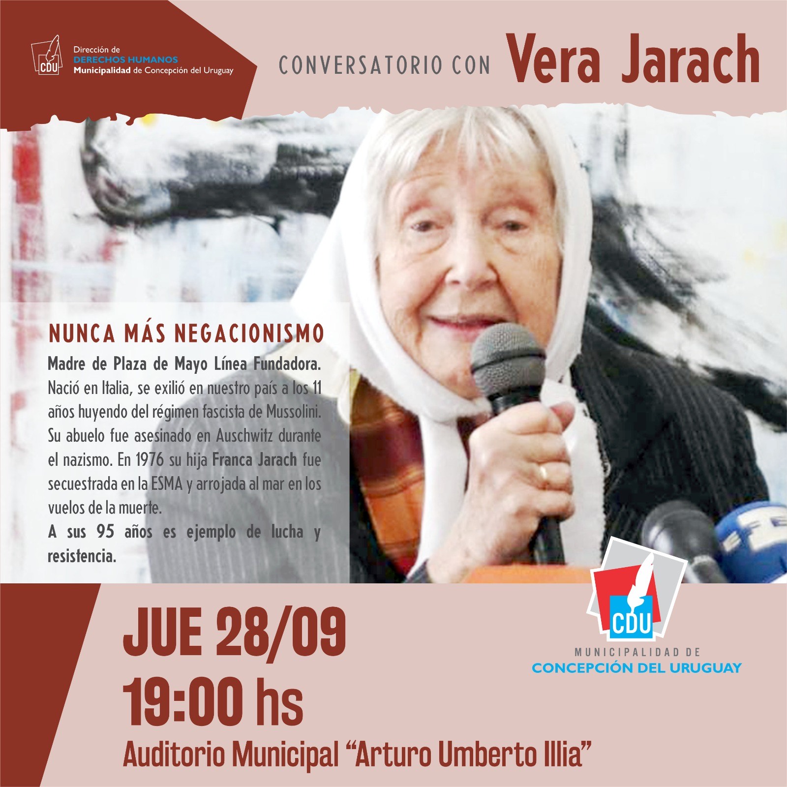 La invitación es a las 19. Cabe aclarar que la charla estaba prevista en el Auditorio Scelzi, debiendo cambiarse el lugar por razones logísticas._ Este jueves, a las 19:00, se presentará Vera Jarach en el Auditorio Illia, en el marco de un conversatorio que organiza la Dirección de Derechos Humanos de la Municipalidad, con el título “Nunca más negacionismo”.