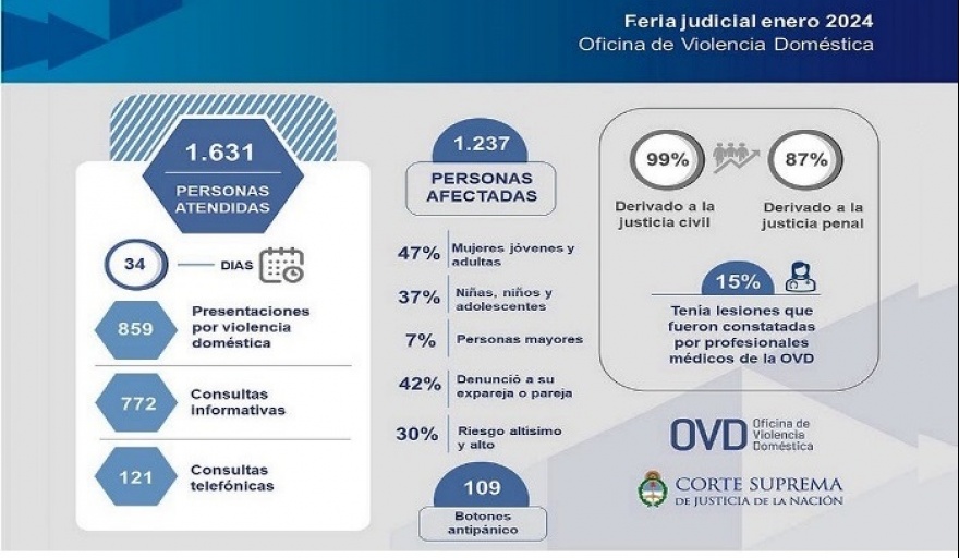 Un informe elaborado por la Oficina de Violencia Doméstica (OVD) de la Corte Suprema de Justicia de la Nación, indica que, durante la feria judicial de enero de este año, atendió a 1.631 personas, lo que representa un promedio de 34 por día o 1,4 por hora. Mediante un comunicado oficial publicado este miércoles, el organismo detalla que, de ese total, 1.237 personas fueron víctimas de violencia doméstica, de las cuales, el 47 por ciento fueron mujeres jóvenes y adultas.