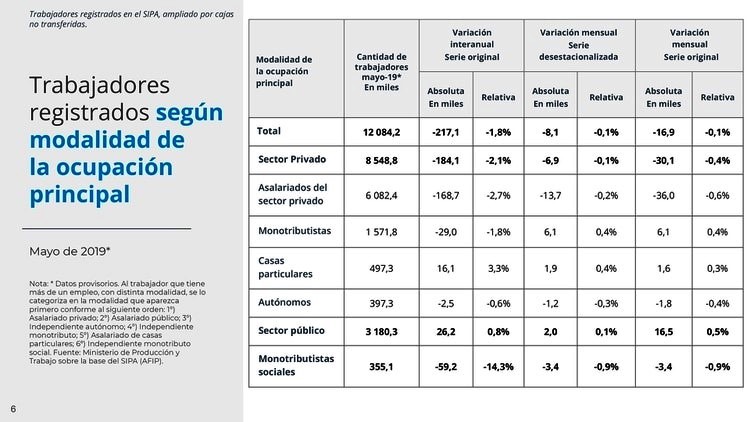 En cuanto a los monotributistas, si bien cayeron 1,8% respecto de mayo del año pasado (29.000 menos), se registraron 6.100 más (0,4%) que los que había en abril. Con la excepción de marzo, la evolución de los monotributistas fue positiva en todos los meses del año y sumaron 9.200 trabajadores más desde diciembre de 2018, precisó el informe oficial. En mayo, había 1.571.800 registradas bajo esta modalidad.