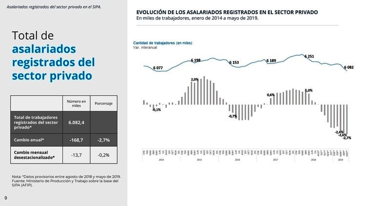 Es una cifra bastante similar a la de abril, cuando la caída había sido de 203.900 trabajadores. Frente al mes anterior, se registró una merma de 0,1%, lo que implica 8.100 trabajadores formales menos. El mes pasado, la variación mensual había sido de 0%. «El total de trabajadores registrados continúa estable en lo que va de 2019. En línea con el comportamiento de la economía en los primeros 5 meses del año, la cantidad de trabajadores registrados se mantuvo prácticamente constante en mayo», remarcó la cartera productiva.