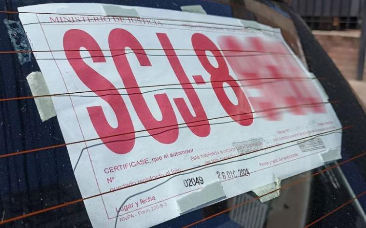En lugar de la chapa definitiva, los propietarios de autos reciben un papel con un código en letras rojas que deben pegar en el parabrisas y en la luneta trasera. En el caso de los titulares de moto, un permiso de circulación. Tienen las mismas obligaciones y responsabilidades que quienes tienen la patente, pero provoca problemas.
