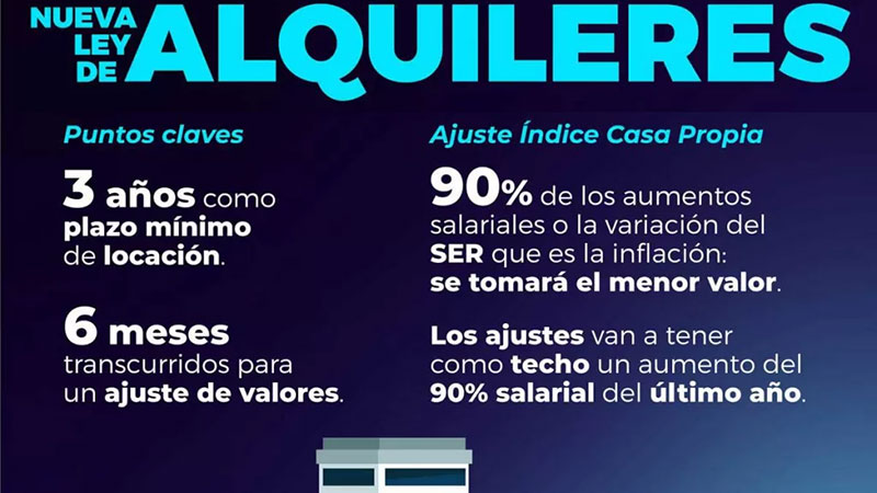 En base a lo dispuesto en la nueva ley, los contratos de alquiler seguirán teniendo una duración de tres años, deberán ser estipulados «en valor único en moneda nacional» y se podrán realizar «ajustes con periodicidad a intervalos no inferiores a seis meses».